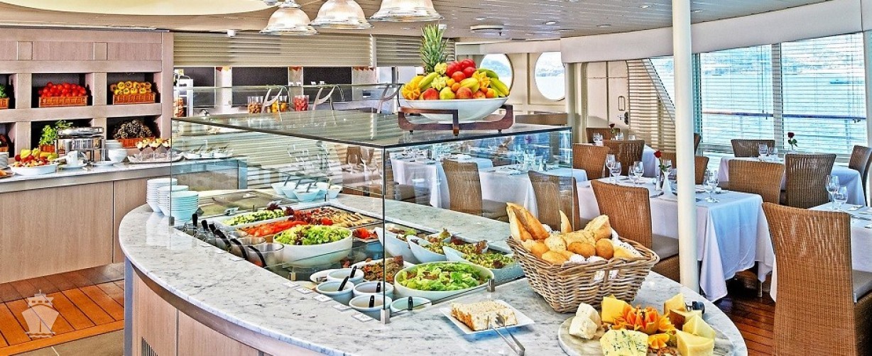 kajutová služba je k dispozícii 24 hodín denne. Raňajkové menu od 6:00 do 11:00, obed od 12:00 do 22:00, ako aj večerné menu z Amfory podávané počas otváracích hodín reštaurácie. A potom nočné menu od 22:00 do 06:00 ráno.