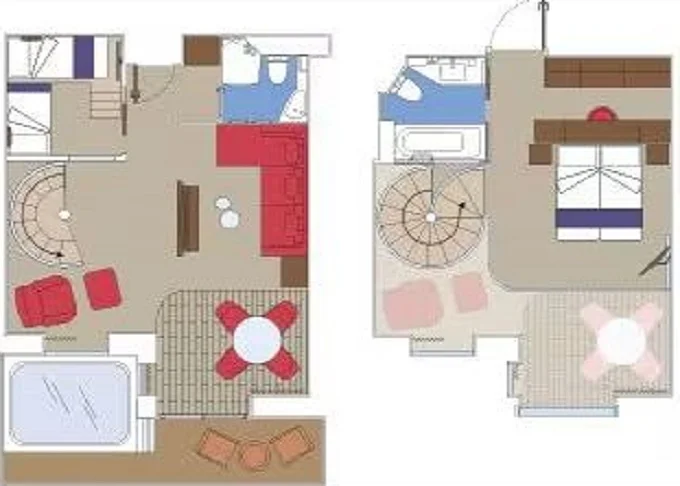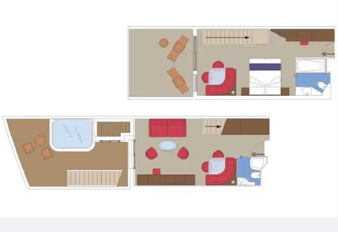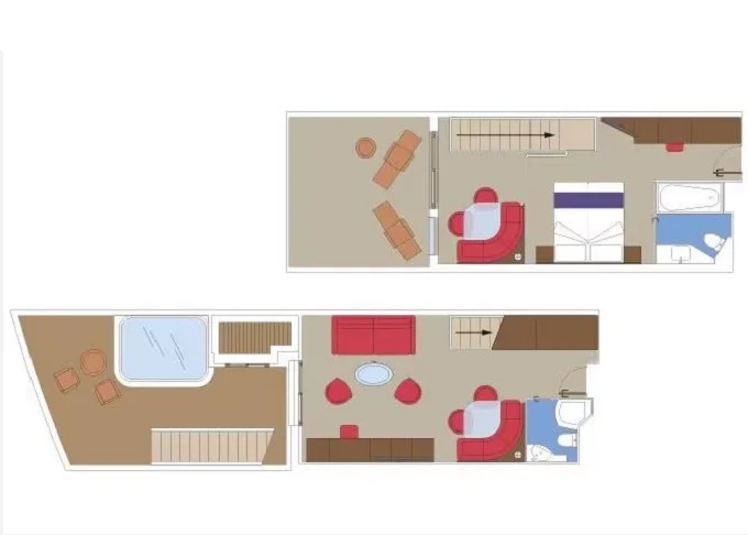 | YJD - Yacht Club Duplex Suite s vírivkou 46 m² + balkón 30 m². Vírivka. 2 podlažia, šatník, 2 kúpeľne (1 s vaňou). Max 4 osoby. 16. paluba. Cenový model MSC Yacht Club. Easy package v cene | 9 802 € 4 901 € za osobu | ||
