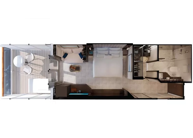 | Ocean Residence - Cove Residence Suita + terasa so sedením a lehátkami 56 m². Spálňa s obývacou a jedálenskou časťou, šatník. Koktailová súprava, minibar, kávovar, vodná kanvica, ďalekohľad, sejf, kúpeľňa so sprchou. Závesy, svetlo, klimatizácia ovládané smart technológiou. Taška Technogym Case Kit. Fľaša šampanského na privítanie. Maximálna kapacita 3 osoby. | 76 020 € 19 005 € za osobu | ||