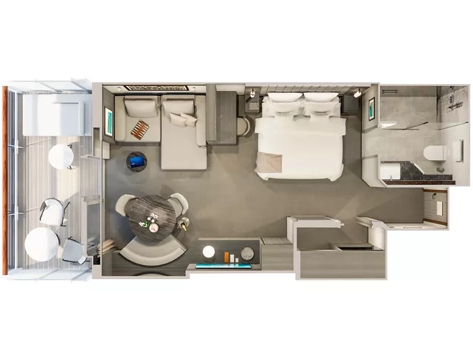 | Retreat Residence Suita 63 m² + Terasa s vírivkou a sedením 14 m² / 7. paluba: 18 m². Spálňa s obývacou a jedálenskou časťou, šatník. Koktailová súprava, minibar, kávovar, vodná kanvica, ďalekohľad, sejf, mramorová kúpeľňa s vaňou a sprchou, extra wc. Taška Technogym Case Kit. Fľaša šampanského na privítanie. Služby osobného majordóma. Maximálna kapacita 3 dospelí alebo 2 dospelí + 2 deti pod 18 rokov. | 90 160 € 22 540 € za osobu | ||