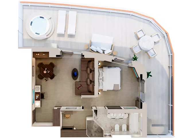 | Ocean Residence - Cove Residence s vírivkou Suita + terasa s vírivkou a lehátkami 56 m². Spálňa s obývacou a jedálenskou časťou, šatník. Koktailová súprava, minibar, kávovar, vodná kanvica, ďalekohľad, sejf, kúpeľňa so sprchou. Závesy, svetlo, klimatizácia ovládané smart technológiou. Taška Technogym Case Kit. Fľaša šampanského na privítanie. Maximálna kapacita 3 osoby. | 45 760 € 45 760 € za osobu | ||